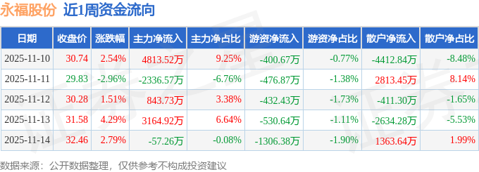 资金流向数据方面,本周永福股份主力资金合计净流入6428.34万元,游资资金合计净流出3147.0万元,散户资金合计净流出3281.34万元。本周资金流向一览见下表: