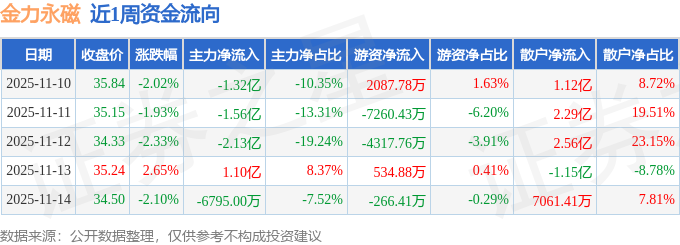 资金流向数据方面,本周金力永磁主力资金合计净流出4.59亿元,游资资金合计净流出9221.93万元,散户资金合计净流入5.52亿元。本周资金流向一览见下表: