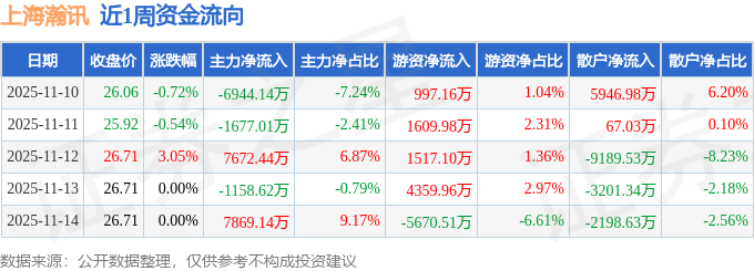 沪深股通持股方面,截止2025年11月14日收盘,上海瀚讯深股通持股数为118.28万股,占流通股比为19.0%。