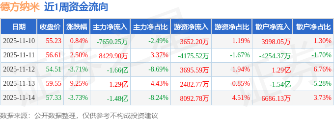 资金流向数据方面,本周德方纳米主力资金合计净流出1.77亿元,游资资金合计净流入1.37亿元,散户资金合计净流入3902.6万元。本周资金流向一览见下表: