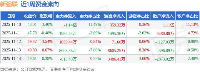 资金流向数据方面,本周新强联主力资金合计净流出2.1亿元,游资资金合计净流入1.1亿元,散户资金合计净流入9968.01万元。本周资金流向一览见下表: