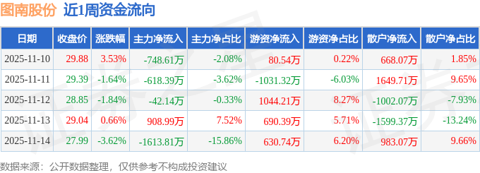 资金流向数据方面,本周图南股份主力资金合计净流出2113.96万元,游资资金合计净流入1414.55万元,散户资金合计净流入699.41万元。本周资金流向一览见下表: