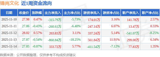资金流向数据方面,本周锋尚文化主力资金合计净流出899.7万元,游资资金合计净流入908.69万元,散户资金合计净流出8.99万元。本周资金流向一览见下表: