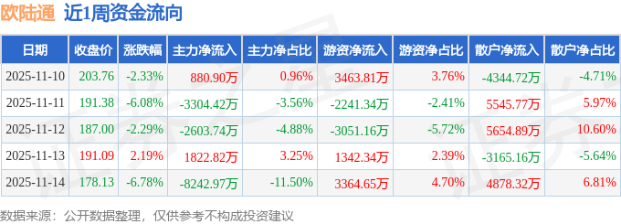 资金流向数据方面,本周欧陆通主力资金合计净流出1.14亿元,游资资金合计净流入2878.31万元,散户资金合计净流入8569.1万元。本周资金流向一览见下表: