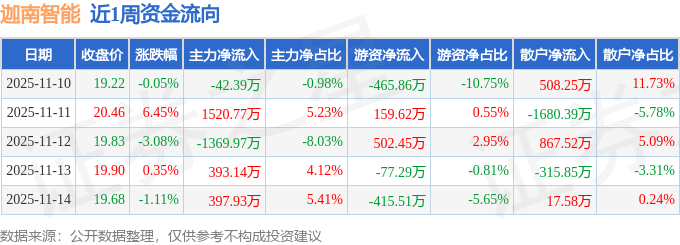 资金流向数据方面,本周迦南智能主力资金合计净流入899.48万元,游资资金合计净流出296.6万元,散户资金合计净流出602.89万元。本周资金流向一览见下表: