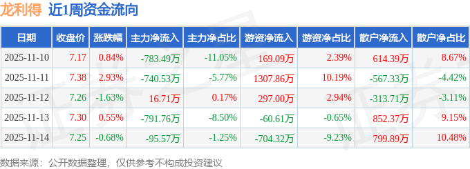 资金流向数据方面,本周龙利得主力资金合计净流出2394.64万元,游资资金合计净流入1009.03万元,散户资金合计净流入1385.62万元。本周资金流向一览见下表:
