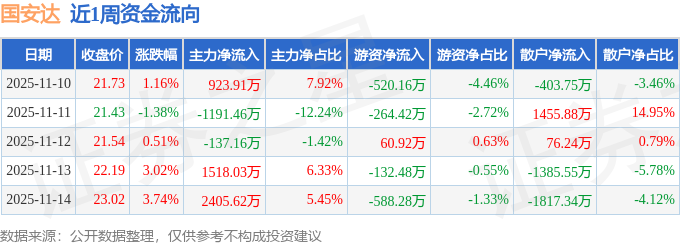 资金流向数据方面,本周国安达主力资金合计净流入3518.94万元,游资资金合计净流出1444.43万元,散户资金合计净流出2074.52万元。本周资金流向一览见下表: