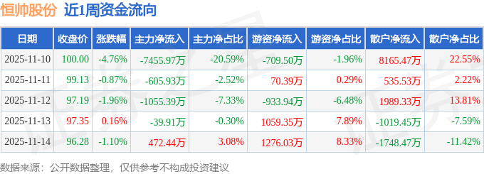 资金流向数据方面,本周恒帅股份主力资金合计净流出8684.75万元,游资资金合计净流入762.33万元,散户资金合计净流入7922.42万元。本周资金流向一览见下表: