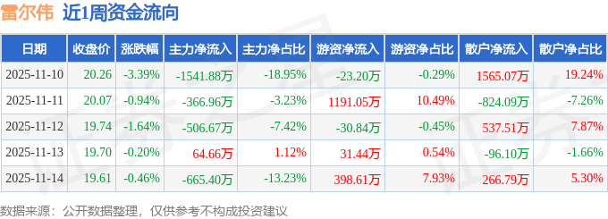 资金流向数据方面,本周雷尔伟主力资金合计净流出3016.24万元,游资资金合计净流入1567.06万元,散户资金合计净流入1449.18万元。本周资金流向一览见下表: