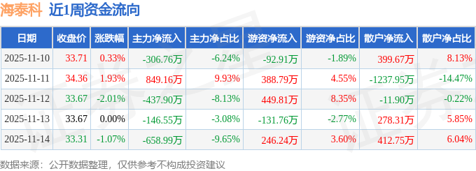 资金流向数据方面,本周海泰科主力资金合计净流出701.05万元,游资资金合计净流入860.17万元,散户资金合计净流出159.12万元。本周资金流向一览见下表: