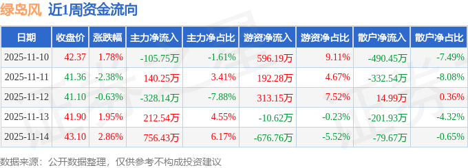 资金流向数据方面,本周绿岛风主力资金合计净流入675.33万元,游资资金合计净流入414.26万元,散户资金合计净流出1089.59万元。本周资金流向一览见下表: