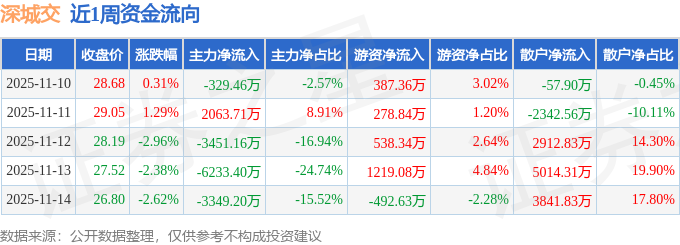 资金流向数据方面,本周深城交主力资金合计净流出1.13亿元,游资资金合计净流入1931.01万元,散户资金合计净流入9368.5万元。本周资金流向一览见下表: