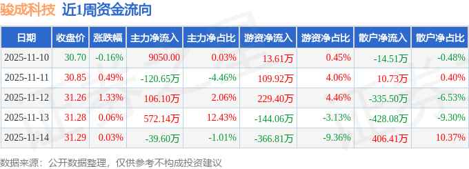 资金流向数据方面,本周骏成科技主力资金合计净流入518.9万元,游资资金合计净流出157.95万元,散户资金合计净流出360.95万元。本周资金流向一览见下表: