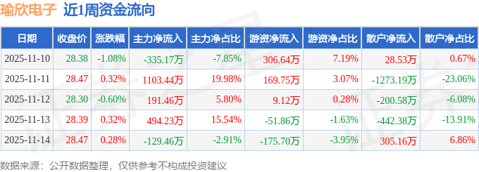 资金流向数据方面,本周瑜欣电子主力资金合计净流入1324.5万元,游资资金合计净流入257.96万元,散户资金合计净流出1582.46万元。本周资金流向一览见下表: