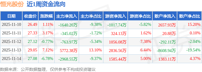 资金流向数据方面,本周恒光股份主力资金合计净流入54.65万元,游资资金合计净流入4784.48万元,散户资金合计净流出4839.13万元。本周资金流向一览见下表: