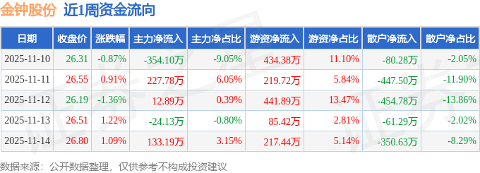 资金流向数据方面,本周金钟股份主力资金合计净流出4.38万元,游资资金合计净流入1398.86万元,散户资金合计净流出1394.48万元。本周资金流向一览见下表: