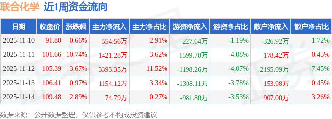 资金流向数据方面,本周联合化学主力资金合计净流入6598.11万元,游资资金合计净流出5315.5万元,散户资金合计净流出1282.61万元。本周资金流向一览见下表:
