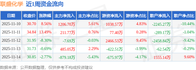 资金流向数据方面,本周联盛化学主力资金合计净流入1016.65万元,游资资金合计净流入2484.03万元,散户资金合计净流出3500.68万元。本周资金流向一览见下表: