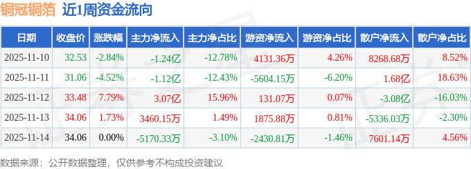 资金流向数据方面,本周铜冠铜箔主力资金合计净流入5343.53万元,游资资金合计净流出1896.65万元,散户资金合计净流出3446.88万元。本周资金流向一览见下表: