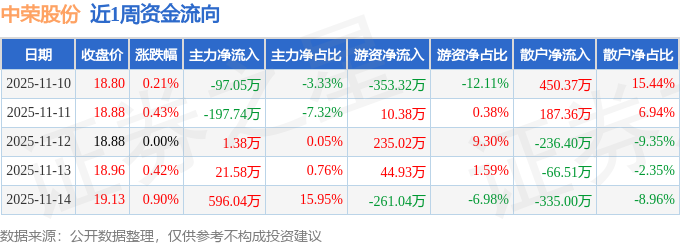 资金流向数据方面,本周中荣股份主力资金合计净流入324.21万元,游资资金合计净流出324.02万元,散户资金合计净流出0.19万元。本周资金流向一览见下表:
