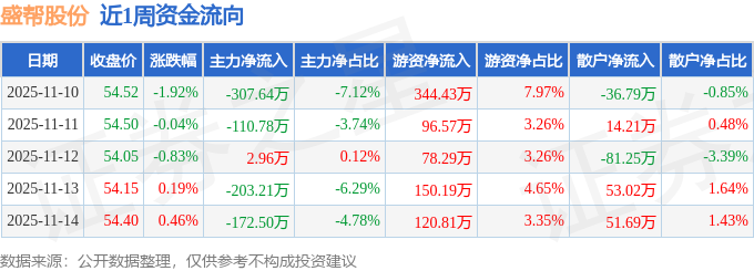 资金流向数据方面,本周盛帮股份主力资金合计净流出791.17万元,游资资金合计净流入790.3万元,散户资金合计净流入0.87万元。本周资金流向一览见下表: