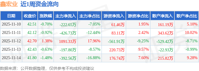 资金流向数据方面,本周鑫宏业主力资金合计净流出148.41万元,游资资金合计净流出19.87万元,散户资金合计净流入168.28万元。本周资金流向一览见下表: