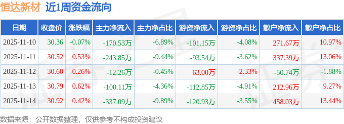 资金流向数据方面,本周恒达新材主力资金合计净流出863.84万元,游资资金合计净流出365.47万元,散户资金合计净流入1229.31万元。本周资金流向一览见下表: