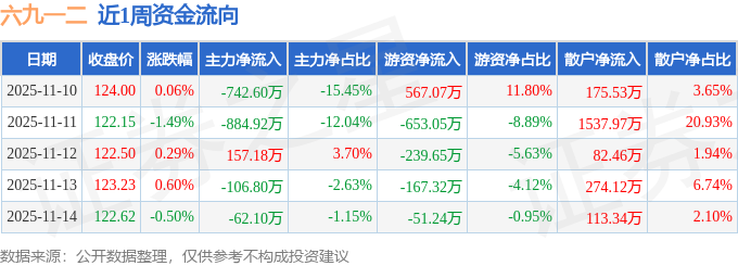资金流向数据方面,本周六九一二主力资金合计净流出1639.25万元,游资资金合计净流出544.18万元,散户资金合计净流入2183.43万元。本周资金流向一览见下表: