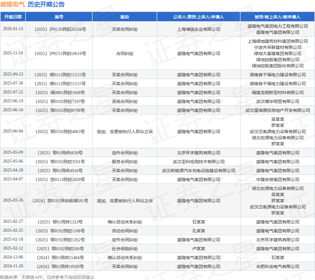 案号:(2025)沪0151民初10619号根据统计,近一年内以盛隆电气集团有限公司为当事人的历史开庭公告有19则,其中案由为“买卖合同纠纷”的公告以8则居首,其次为“定作合同纠纷”有2则,“确认劳动关系纠纷”有2则。历史开庭公告如下: