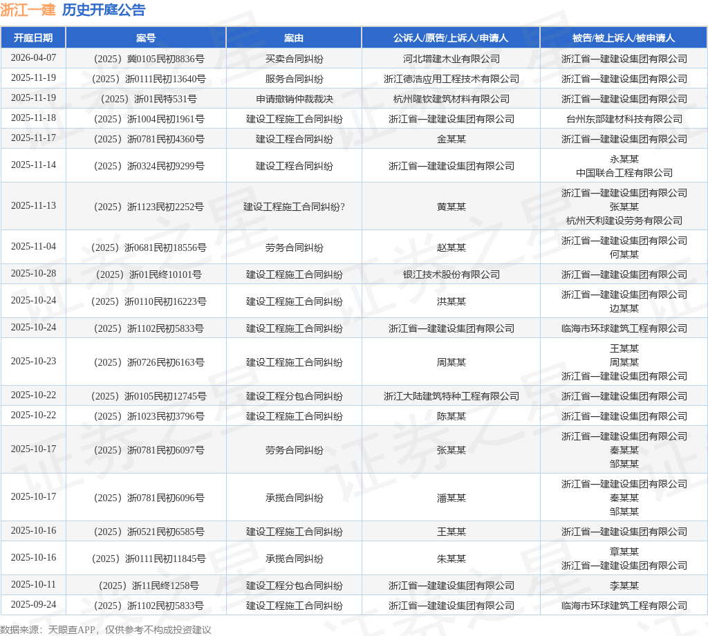 案号:(2025)浙0111民初13640号根据统计,近一年内以浙江省一建建设集团有限公司为当事人的历史开庭公告有113则,其中案由为“建设工程施工合同纠纷”的公告以39则居首,其次为“劳务合同纠纷”有14则,“建设工程分包合同纠纷”有13则。历史开庭公告(前20条)如下: