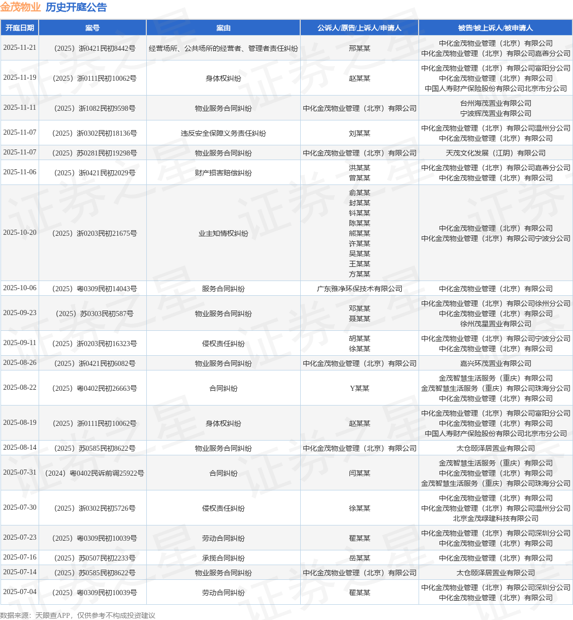 案号:(2025)浙0111民初10062号根据统计,近一年内以中化金茂物业管理(北京)有限公司为当事人的历史开庭公告有46则,其中案由为“物业服务合同纠纷”的公告以19则居首,其次为“服务合同纠纷”有5则,“承揽合同纠纷”有4则。历史开庭公告(前20条)如下: