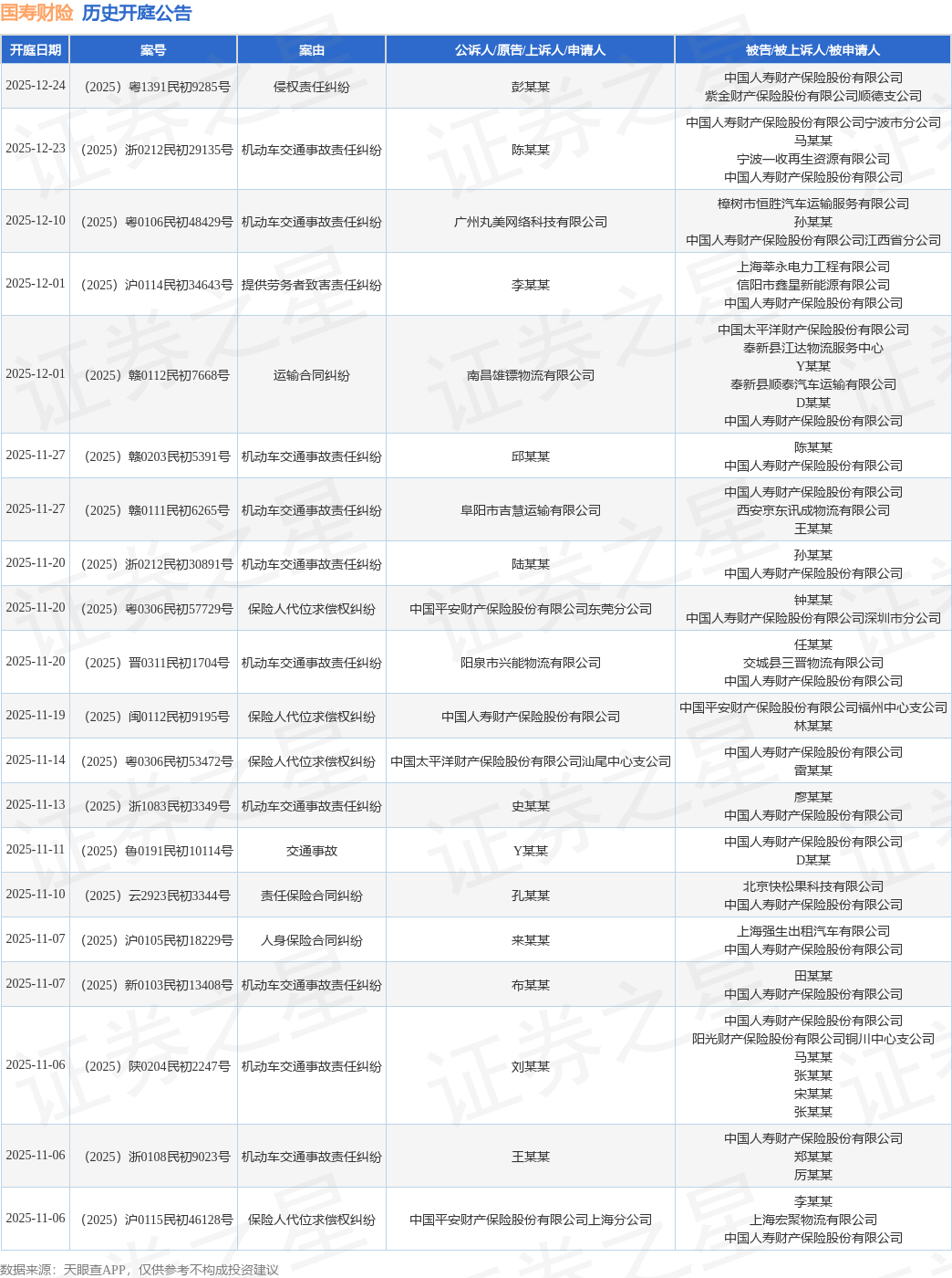 案号:(2025)闽0112民初9195号根据统计,近一年内以中国人寿财产保险股份有限公司为当事人的历史开庭公告有453则,其中案由为“机动车交通事故责任纠纷”的公告以299则居首,其次为“保险人代位求偿权纠纷”有45则,“保险纠纷”有15则。历史开庭公告(前20条)如下: