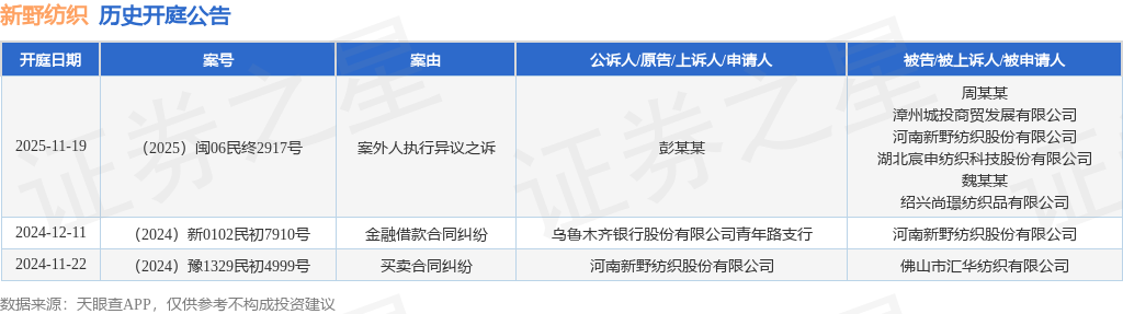 案号:(2025)闽06民终2917号根据统计,近一年内以河南新野纺织股份有限公司为当事人的历史开庭公告有3则,其中案由为“买卖合同纠纷”的公告以1则居首,其次为“案外人执行异议之诉”有1则,“金融借款合同纠纷”有1则。历史开庭公告如下: