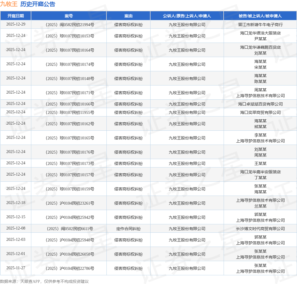 案号:(2025)闽05民终6516号根据统计,近一年内以九牧王股份有限公司为当事人的历史开庭公告有100则,其中案由为“侵害商标权纠纷”的公告以90则居首,其次为“不正当竞争纠纷”有2则,“买卖合同纠纷”有1则。历史开庭公告(前20条)如下: