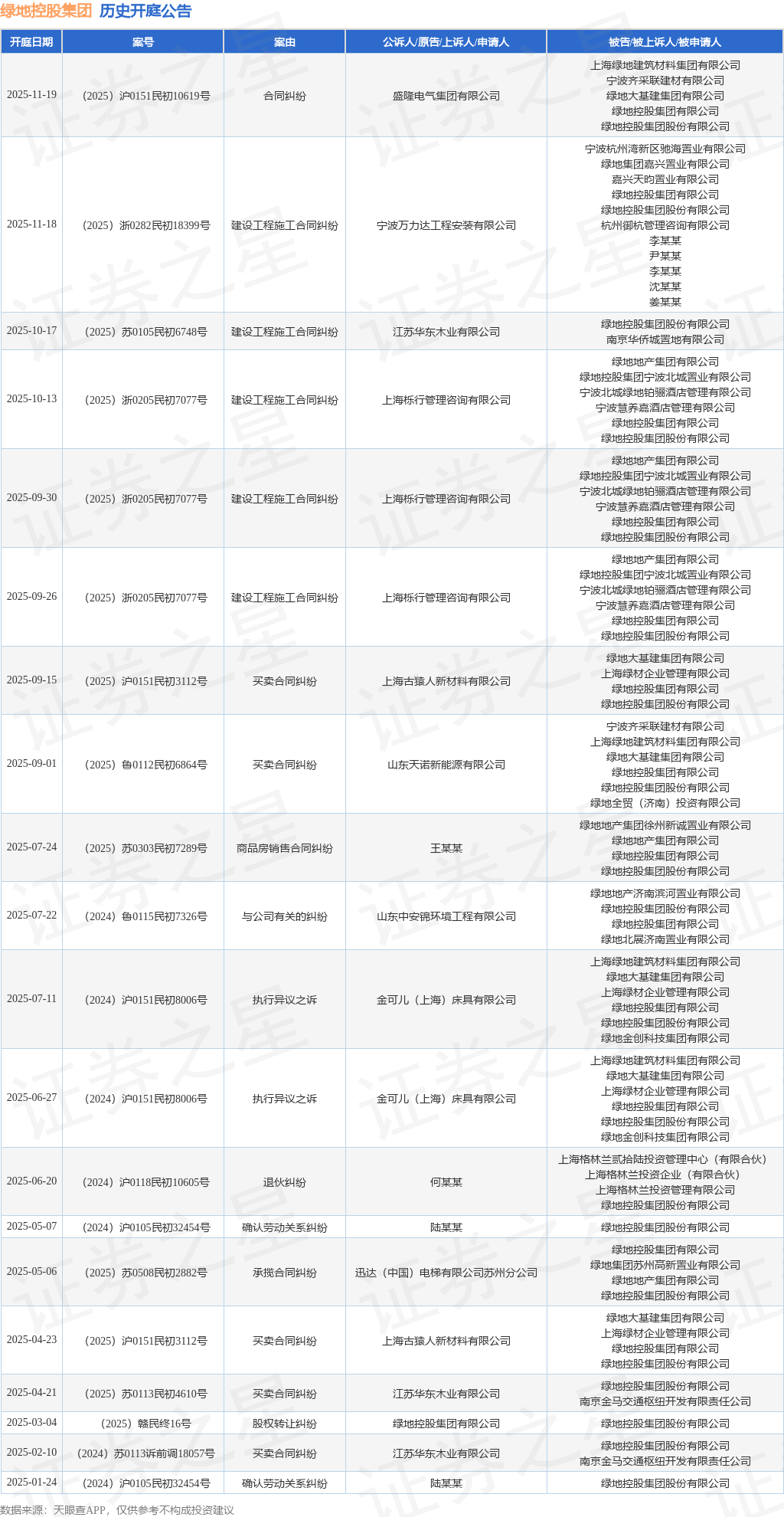 案号:(2025)沪0151民初10619号根据统计,近一年内以绿地控股集团股份有限公司为当事人的历史开庭公告有24则,其中案由为“买卖合同纠纷”的公告以8则居首,其次为“建设工程施工合同纠纷”有5则,“执行异议之诉”有3则。历史开庭公告(前20条)如下: