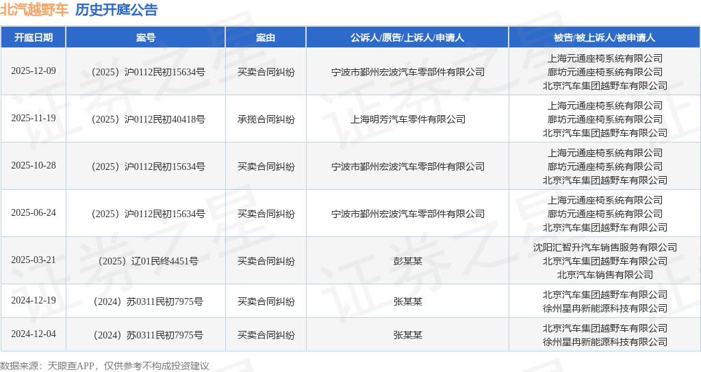 根据统计,近一年内以北京汽车集团越野车有限公司为当事人的历史开庭公告有7则,其中案由为“买卖合同纠纷”的公告以6则居首,其次为“承揽合同纠纷”有1则。历史开庭公告如下: