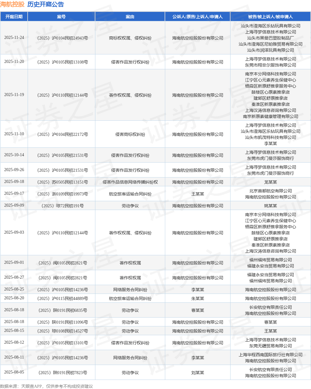 案号:(2025)沪0110民初12144号根据统计,近一年内以海南航空控股股份有限公司为当事人的历史开庭公告有70则,其中案由为“劳动争议”的公告以31则居首,其次为“航空旅客运输合同纠纷”有11则,“侵害作品发行权纠纷”有4则。历史开庭公告(前20条)如下: