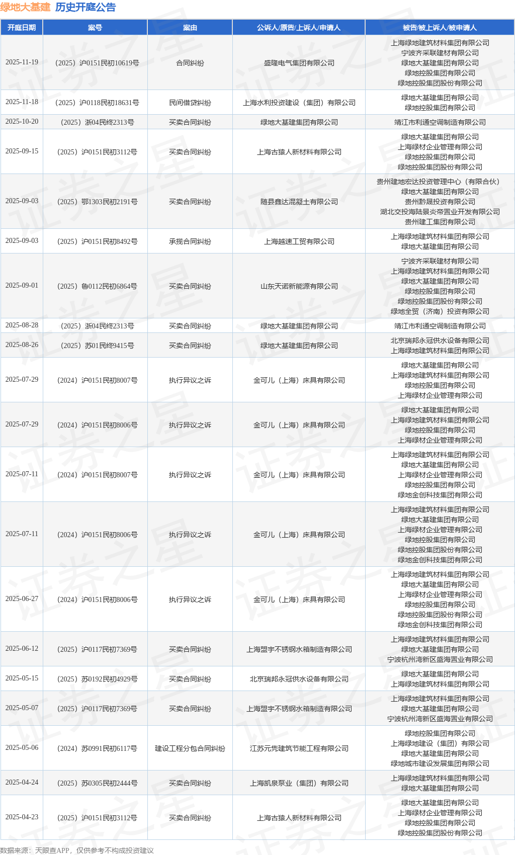 案号:(2025)沪0151民初10619号根据统计,近一年内以绿地大基建集团有限公司为当事人的历史开庭公告有25则,其中案由为“买卖合同纠纷”的公告以13则居首,其次为“执行异议之诉”有7则,“建设工程分包合同纠纷”有2则。历史开庭公告(前20条)如下: