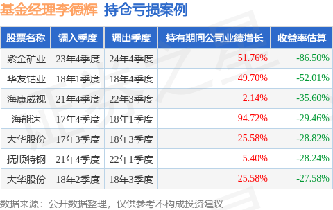 李德辉管理的摩根卓越制造股票A基金在23年4季度买入紫金矿业,在持有1年又0个季度后在24年4季度卖出。持有期间的估算收益率为-86.5%,持有期间紫金矿业在2023年到2024年的年报归属净利润增幅达51.76%。