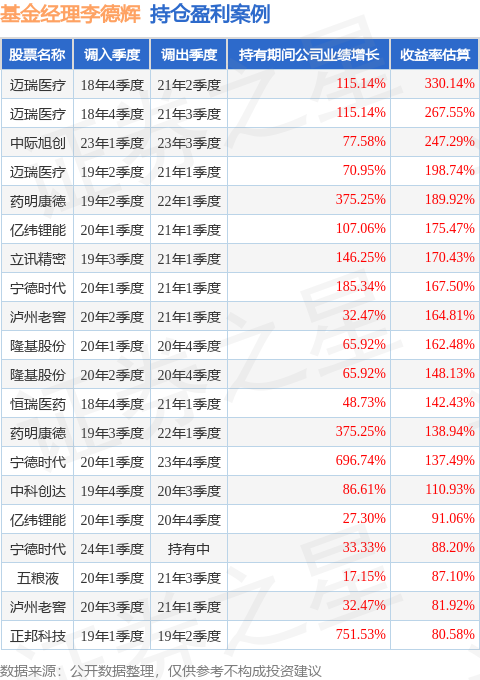 李德辉管理的摩根科技前沿混合A基金在18年4季度买入迈瑞医疗,在持有2年又2个季度后在21年2季度卖出。持有期间的估算收益率为330.14%,持有期间迈瑞医疗在2018年到2021年的年报归属净利润增幅达115.14%。