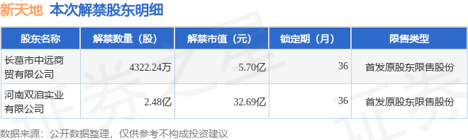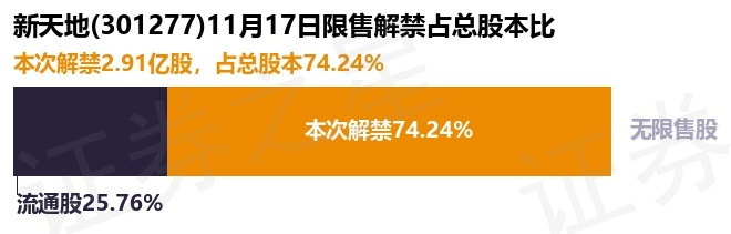 证券之星消息,根据市场公开信息整理,新天地(301277)于11月17日将有2.91亿股限售股份解禁,为公司首发原股东限售股份,占公司总股本74.24%。(本次数据根据历史公告整理得出,实际情况以上市公司最新公告为准)本次解禁后,公司已无限售股份。具体如下图所示: