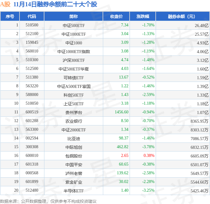 A股融券余额前三分别为:中证500ETF(510500)融券余额26.48亿元、中证1000ETF(512100)融券余额25.57亿元、中证1000(159845)融券余额4.93亿元,前20具体见下表: