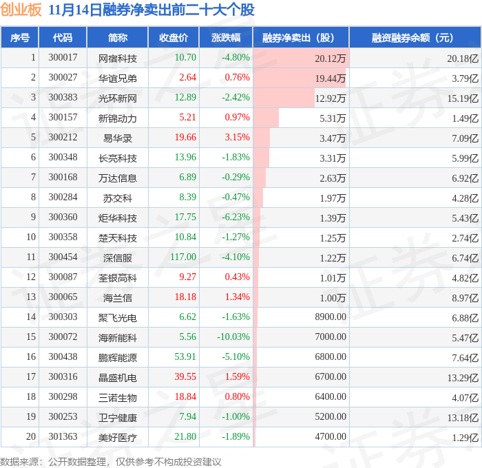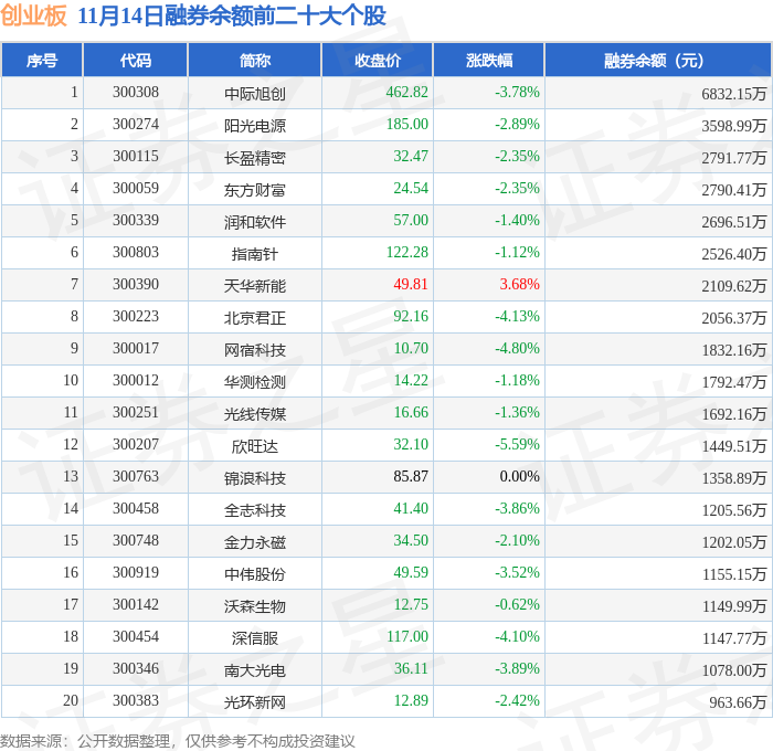 创业板融券余额前三分别为:中际旭创(300308)融券余额6832.15万元、阳光电源(300274)融券余额3598.99万元、长盈精密(300115)融券余额2791.77万元,前20具体见下表:
