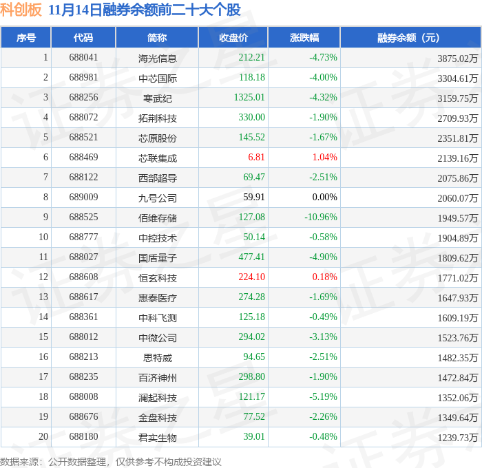 科创板融券余额前三分别为:海光信息(688041)融券余额3875.02万元、中芯国际(688981)融券余额3304.61万元、寒武纪(688256)融券余额3159.75万元,前20具体见下表: