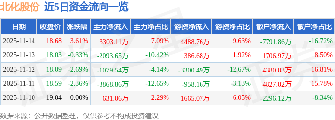 证券之星消息,截至2025年11月14日收盘,北化股份(002246)报收于18.68元,上涨3.61%,换手率4.53%,成交量24.87万手,成交额4.66亿元。