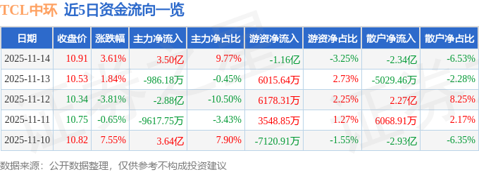 证券之星消息,截至2025年11月14日收盘,TCL中环(002129)报收于10.91元,上涨3.61%,换手率8.08%,成交量326.55万手,成交额35.82亿元。