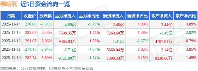 证券之星消息,截至2025年11月14日收盘,德明利(001309)报收于270.0元,下跌7.54%,换手率11.57%,成交量18.62万手,成交额49.96亿元。