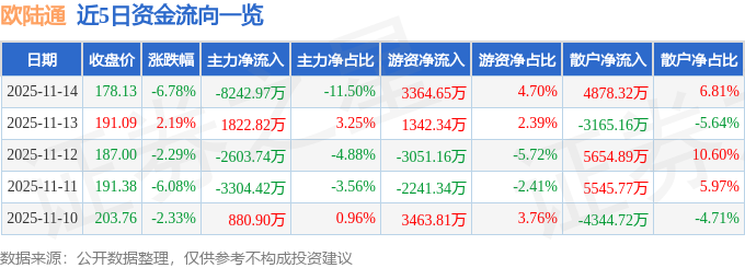 证券之星消息,截至2025年11月14日收盘,欧陆通(300870)报收于178.13元,下跌6.78%,换手率3.61%,成交量3.96万手,成交额7.17亿元。