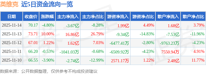 证券之星消息,截至2025年11月14日收盘,英维克(002837)报收于70.17元,下跌4.8%,换手率7.36%,成交量62.54万手,成交额44.32亿元。