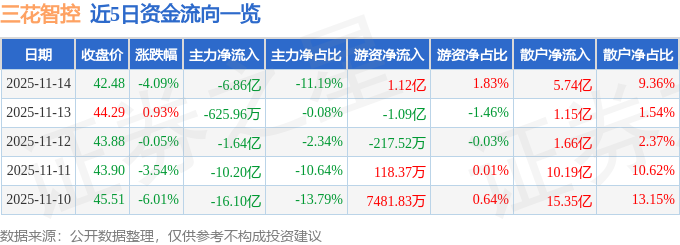 证券之星消息,截至2025年11月14日收盘,三花智控(002050)报收于42.48元,下跌4.09%,换手率3.89%,成交量143.22万手,成交额61.33亿元。